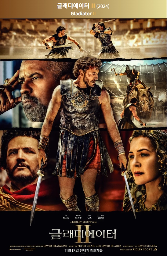 2024년 개봉 예정인 ‘글래디에이터 2(Gladiator II)’는 리들리 스콧 감독이 다시 메가폰을 잡고, 폴 메스칼, 덴젤 워싱턴, 페드로 파스칼, 조셉 퀸 등이 출연하는 대작 역사 영화입니다. 전작 ‘글래디에이터(2000)’가 영화사에 남을 걸작으로 평가받은 만큼, ‘글래디에이터 2’는 전 세계 영화 팬들의 뜨거운 기대 속에서 제작되었습니다. 이번 글에서는 영화 <글래디에이터 2>의 줄거리, 등장인물과 배우, 역사적 배경, 국내외 반응, 총평을 소개합니다.